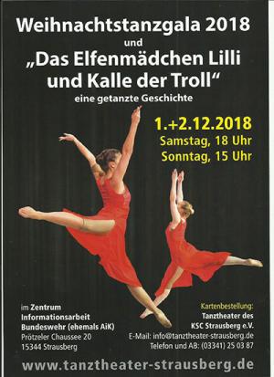 Als Abendprogramm für Familien und Tanzinteressierte präsentiert das Tanztheater eine “Weihnachtstanzgala 2018” und “Das Elfenmädchen Lilli und Kalle der Troll” mit Pause, im Zentrum Informationsarbeit Bundeswehr (ehem. AIK) an folgenden Tagen: