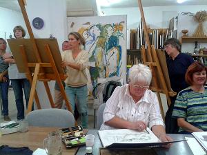 Nach der wohlverdienten Sommerpause im August haben auch wir unsere Arbeit wieder aufgenommen. Gleich zu Beginn hat uns eine schwangere junge Frau Modell gesessen und uns gefordert. Nach Malen vor der Natur, wo Wasser und Architektur im Vordergrund standen, war das, wie jedes Jahr im Herbst, wieder die Aufgabe, die wir unter Anleitung versuchen, zu meistern.