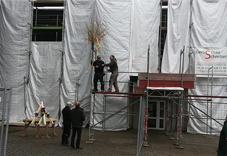 Nachdem der Zimmermannsmeister seinen Richtspruch vorgetragen hatte, schlug Herr Paulat von der Abteilung Judo des KSC Strausberg e.V.symbolisch den letzten Nagel ein. Im Anschluss kamen alle Anwesenden zu einem kleinen Umtrunk und Buffet zusammen. Hier konnten sich die Gäste über den Stand der Bauarbeiten und über die weiteren Maßnahmen mit den Bauherren verständigen. Zum Abschluss gab es die Möglichkeit eines kleinen Baustellenrundgangs.