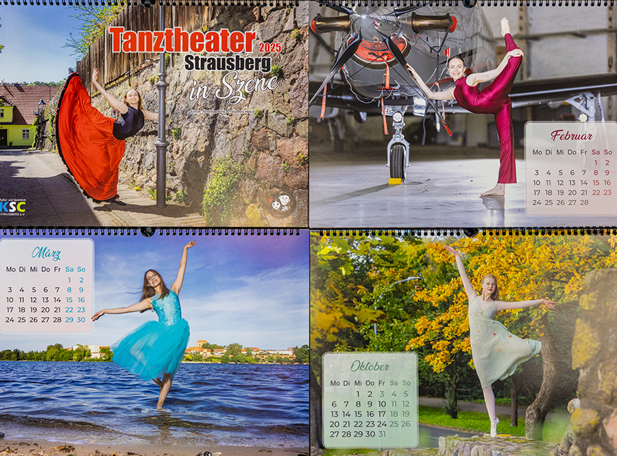 Das Strausberger Tanztheater (im KSC Strausberg e.V.) hat in diesem Jahr einen Fotokalender für das Jahr 2025 produziert. In den einzelnen Monaten ist jeweils eine andere Tänzerin vor einem Strausberger Motiv in Szene gesetzt worden. Sie wurden von Steffen Herre und Andreas Prinz in Strausberg fotografiert.