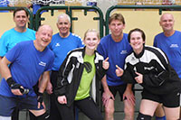 So stellten wir uns um 9.57 Uhr zum 1.Spiel, unterstützt von Maria Gnauck, zum ersten Spiel auf den Platz. Gegner waren die „Hochspringer“, ein Spielermix Ehemaliger vom Reichenberger SV mit Erwin Wetzel an der Spitze. Wir präsentierten uns ganz ordentlich und gewannen den 1.Satz mit 20:15. Inzwischen eingespielt drehten die“ Hochspringer“ den Spieß im 2.Satz um und entschieden ihn mit 20:14 für sich. 10.51 Uhr standen uns die altbekannten Sportfreunde vom SV Mühlenberg VI gegenüber. Wir kamen gut in Schwung, spielten relativ konzentriert, kombinierten im Angriff dieses Mal mit Anika Mertins und gewannen mit 2:0 Sätzen. Damit hatten wir bereits ein 6 Punkte Polster. Im 3.Spiel um 11.45 Uhr trafen wir auf die Old Schmetterhands, Sportfreunde aus Fredersdorf. Unser Gegner fand im 1.Satz nicht zu seinem Rhythmus, so dass wir unser Spiel aufziehen. Wir konnten diesen mit 20:13 für uns entscheiden. Im 2.Satz änderten die Schmetterhands ihre Taktik und überraschten uns im Angriff mit Kurzpassvarianten. Wir hatten Schwierigkeiten, uns darauf einzustellen und unterlagen deshalb knapp mit 17:20. Auf unserem Spielplan stand um 12.37 Uhr als Gegner der Gastgeber, die Eggersdorfer Oldie Fighter, der mehrmalige Sieger des Turniers und auch heiße Favorit dieses Jahr. Sie hatten in den bisherigen Spielen nur einen Satz abgeben müssen. Entsprechend stark begannen sie auch gegen uns. Wir freuten uns über jeden Punkt, den wir gegen die EOF gewinnen konnten, unterlagen aber achtbar mit 13:20 im ersten Satz. Im 2. Satz kamen wir besser ins Spiel, führten teilweise mit 2 Punkten, zogen allerdings auch hier im Endeffekt mit 16:20 den Kürzeren. Nach einer Pause war im letzten Spiel ein Sechser aus Ribnitz unser Gegner. Der Ribnitzer Mix von der Küste brachte uns in Satz 1 mit 16:20 eine unerwartete, böse Niederlage bei. Nach der Pause noch kalt, ein neuer Spielball und mangelnde Konzentration beim Spiel waren mögliche Ursachen dafür. Das Ziel vor den Augen, der 3.Platz, bäumten wir uns in Satz 2 noch einmal auf. Aufgrund der besseren Zuspiele folgten erfolgreiche Angriffe von Anika, Andreas und Thomas. Gutes Zusammenspiel, sichere Feldabwehr und präzise Angaben waren der Grundstein für den 20:5 Erfolg der Mannschaft.